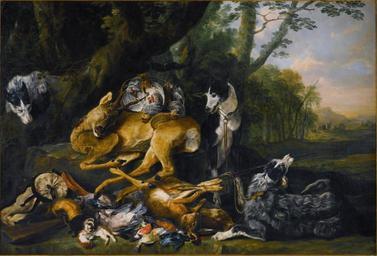 | Keywords: Jan Fyt - The spoils of the chase being guarded by a dog, a landscape beyond.jpg Artwork Creator Jan Fyt 1649 Oil on canvas size cm 137 201 object history credit line signed and dated lower left Ioanes FyT /1649 formerly part of the Thyssen-Bornemisza collection sold at Sotheby's on 9 July 2014 accession number http //www sothebys com/en/auctions/ecatalogue/2014/old-master-british-paintings-evening-l14033/lot 58 html PD-old-100 PD-old-100 Hunting pieces by Joannes Fijt Baroque paintings of animals Hunting trophies in art 1649 paintings 17th-century still life paintings of dead game by Jan Fyt 17th-century greyhounds in art Hunting with greyhounds in art |