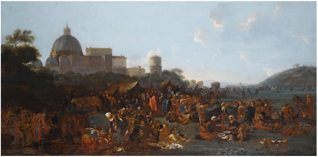 | Keywords: Jan Miel - Figures Feasting at a Fair in Prati, Outside the Walls of Rome, with the Saint Peter's Basilica and Monte Mario Beyond.PNG Artwork creator Jan Miel other date ~ 1650 oil on canvas size cm 87 5 174 5 object history credit line Sotheby's auction 08 May 2007 in Amsterdam lot 33 accession number http //www sothebys com/en/auctions/ecatalogue/lot 33 html/2007/old-master-paintings-am1027 PD-old-100 Jan Miel Paintings of Rome Saint Peter's Basilica in art exterior Monte Mario Rome | ||||