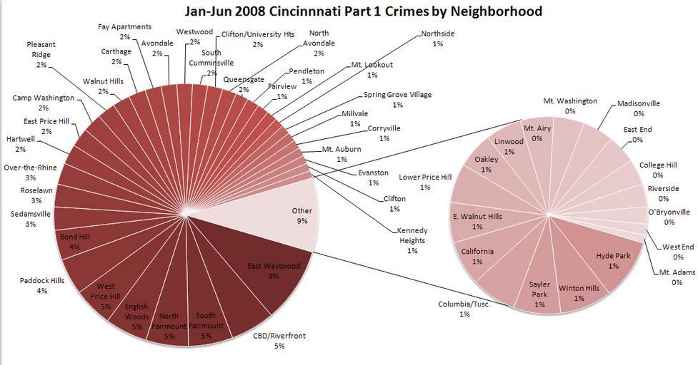 | Keywords: Jan-thru-Jun-2008-Cincinnnati-Part-1-Crimes.jpg Cincinnati Ohio neighborhoods Part 1 crimes consist of murder rape robbery aggravated assault burglary larceny and auto theft In this chart East Westwood has the highest percentage of Part 1 crimes of all Cincinnati neighborhoods while Mount Adams has the lowest percentage Data was collected from http //www cincinnati-oh gov/police/pages/-5304-/ and the pie chart was generated using Microsoft Excel 2007 Own Wholtone 2008-08-09 Crime statistics Mount Adams Cincinnati Cincinnati Ohio |