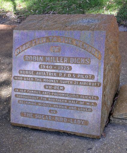 | Keywords: Jandakot Memorial SMC 2006.jpg Memorial in Jandakot airport perth WA to The Sugar Bird Lady Robin Miller Dicks Taken by me SeanMack Robin Miller Dicks 1940-1975 was a Flying Nurse Pilot whose work for the Aborigines gained her the name of ˜Sugarbird Lady ™ She was only 35 when she died of cancer http //72 14 203 104/search q cache xZZg1xyqVT4J www berkelouw com au/file 3Fnode_id 3D5186+robin+miller+dicks+memorial hl en gl au ct clnk cd 1 2006-01-29 own assumed SeanMack Transcription center center DEDICATED TO THE MEMORY OF ROBIN MILLER DICKS 1940-1975 NURSE AVIATRIX R F D C PILOT WHO USED THE MOONEY SUPER 21 AIRCRAFT VH-REM IN HER FAMOUS ANTI-POLIOMYELITIS FLIGHTS THROUGHTOUT THE NORTHERN HALF OF W A BECOMING WIDELY KNOWN AND LOVED AS THE SUGAR-BIRD-LADY Jandakot Airport Photographs by SeanMack Royal Flying Doctor Service |