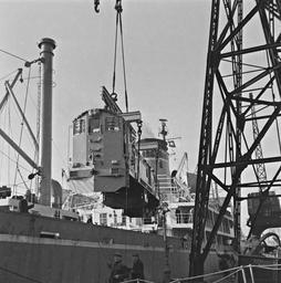 | Keywords: general motors generalmotors gm diesel locomotive b124 ship north wall northwall dublin ireland leinster cranes dockers coras iompair éireann corasiompairéireann c.i.é cié trains railways railroads january 1961 1960s sixties james p. o'dea jamespodea 8-567cr 8567cr single cab bo-bo singlecabbobo national library of ireland nationallibraryofireland o'dea photographic collection odeaphotographiccollection blackandwhite monochrome outdoor black and white This is General Motors or GM diesel locomotive B124 being unloaded from a ship at the North Wall in Dublin following its arrival on a ship from America. Thanks to Seuss. for this link to tons of information about B124 on the Irish Traction's Group website... Date: 4 January 1961 NLI Ref.: ODEA 23/8 This is General Motors or GM diesel locomotive B124 being unloaded from a ship at the North Wall in Dublin following its arrival on a ship from America. Thanks to Seuss. for this link to tons of information about B124 on the Irish Traction's Group website... Date: 4 January 1961 NLI Ref.: ODEA 23/8 |