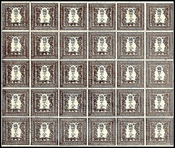 | Keywords: Japan 1871 48M.jpg en Japan 48M mint dark brown Dragon Plate 2 white normal paper positions 1 - 6 / 9 - 14 / 17 - 22 / 25 - 30 and 33 - 38 Position 11 with variety 'Flame of right dragon missing' position 27 with variety 'Half moon dragon' Genuine certified by Eichhorn BPP 1871 Scan of original Government of Japan PD-old-100 Stamps of Japan Stamps of Japan 1871 |