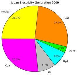 | Keywords: Japan Electricity Production 2009.svg en Japan's electricity generation by fuel source in 2009 Graph based on data given in Eliza Strickland Can Japan phase out nuclear power IEEE Spectrum 11 12 2012 page 11 Numerical data based on International Energy Agency Energy Balances of OECD Countries 2010 Edition This graph is based on data from a public domain PNG graph made in 2012 by Zureks 2015-12-01 own Douglas Perkins other versions The code used to generate this graph is as follows <pre> /usr/bin/env python from matplotlib import pyplot from matplotlib import ticker from matplotlib import numpy This generates a pie graph showing Japan's electricity production in 2009 See also Can Japan phase out nuclear power by Eliza Strickland IEEE Spectrum 11 12 2012 page 11 https //commons wikimedia org/wiki/File Japan_electricity_generation_2009 png This file was written by Douglas Perkins It is released under a Creative Commons Zero 1 0 license https //creativecommons org/publicdomain/zero/1 0/ data Oil 8 7 Hydro 7 8 Other 2 9 Gas 27 2 Nuclear 26 7 Coal 26 7 sources d0 for d in data times d1 for d in data colors 'silver' 'cyan' 'lime' 'darkorange' 'yellow' 'magenta' 'silver' Make a pie graph pyplot figure num 1 figsize 6 6 pyplot title Japan Electricity Generation 2009 pyplot pie times labels sources autopct ' 1 1f ' colors colors pctdistance 0 85 startangle -84 pyplot axis 'equal' pyplot savefig 'Japan Electricity Production 2009 svg' format 'svg' bbox_inches 'tight' </pre> cc-zero Energy in Japan Uploaded with UploadWizard |