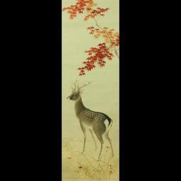 Keywords: japan japanese scroll deer stag asian antique autumn maple leaves fall foliage red painting art