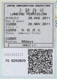 | Keywords: Japan Landing Permission 90 Days 2011.jpg zh-hant 日 羽田機場發給的90天短 上陸許可 en Landing Permission of Japan for 90 Days Issued on August 2011 at Tokyo Haneda International Airport ja 日 上陸許可 zh-hans 日 羽田 发给的90天短 上陆许可 2011-12-11 own Mikepanhu cc-zero Uploaded with UploadWizard Visas of Japan |
