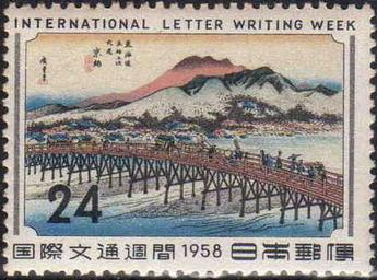 | Keywords: Japan Stamp in 1958 International Letter Writing Week.JPG This stamp does not pass from publication for 52 years However the art work which became the original picture of the stamp passes from the author death for 100 years Therefore it is the second creation thing of the work of PD and it is PD ja 1958å¹´ã«æ—¥æ ¬ãŒç™ºè¡Œã—ãŸå›½é𛿖‡é šé ±é–“è¨˜å¿µåˆ‡æ‰‹ã æã‹ã‚Œã¦ã„ã‚‹ã®ã¯æ ±æµ·é“53次ã®ã Œäº¬å¸«ã ã 題æ ã«ãªã£ãŸçµµç”»è‡ªä½“ãŒãƒ‘ブリックドメインã§ã‚ã‚‹ã ‚ own stamp collection creator Hiroshige Utagawa and Japan Post Original Stamp Issue 1958-10-05 <gallery>File Hiroshige55 kyoto jpg</gallery> PD-Japan PD-old-100-1923 Keishi The Fifty-three Stations of the TÅkaidÅ Stamps of Japan 1958 |