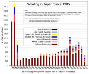 | Keywords: Japan whaling since 1985.svg A chart of whaling by Japan from 1985-2010 Brydes Fin Minke Sei and sperm whale catches in the Antarctic North-West Pacific and coastal Japan <br /><br />Under the International Convention for the Regulation of Whaling ICRW a global ban on commercial whaling has been in effect since 1986 Exceptions are made Under formal objection to the ICRW; By special permits issued by a member country for scientific research; For aboriginal sustinence The catch in '85 '86 and about half of '87 were under objection ; the rest are under the scientific permit exception For the scientific permits in accordance with the Convention the Japanese Government grants an annual quota for scientific research; the whale meat by-product is sold for domestic consumption Own using data from http //www iwcoffice org/conservation/table_permit htm and http //www iwcoffice org/conservation/table_objection htm 8 May 2012 last update Swift modified by Grolltech Statistical charts Economy of Japan Whaling in Japan |