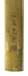 | Keywords: Japanese - Blade - Sword and Dragon - Walters 5112204 - Mark A.jpg This iconography of a dragon wrapped around a sword represents Kôbô Daishi's sword Kôbô Daishi also known as Kûkai; 774-834 was a Buddhist priest who studied in China and founded the Shingon sect of Buddhism in Japan It is said he used a sword that had a rain dragon wrapped around it to bring rain at the end of a drought The signature on the back is a forgery of an earlier artist's signature This is part of a mounted set century 19 Edo-Meiji shakudo gold steel cm 21 3 accession number 51 1220 4 36783 Henry Walters Baltimore date and mode of acquistion unknown Walters Art Museum Henry Walters Acquired by Henry Walters Signature Forged Gotô Kôjô kao place of origin Japan Walters Art Museum license Tosogu Japanese sword fittings in the Walters Art Museum White background Media contributed by the Walters Art Museum needs category review Media contributed by the Walters Art Museum needs artist review |