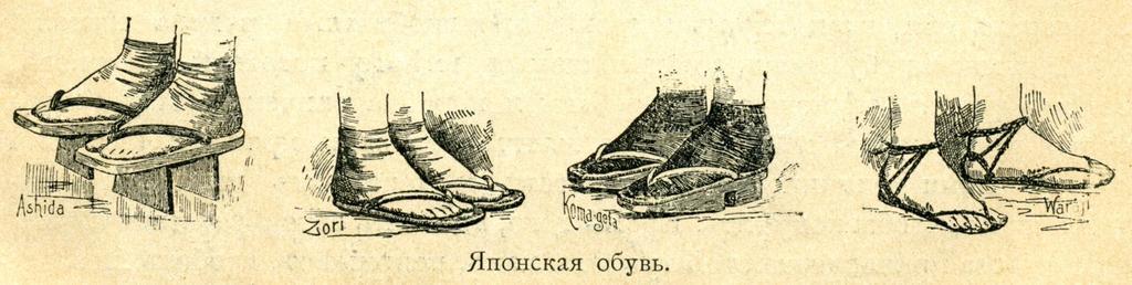 | Keywords: Japanese footwear. Before 1902.jpg  ru Японская обувь Изоб ажение из книги Япония и японцы 1902 год Ст аница 80 en Japanese footwear Image from the book Japan And Japanese 1902 Page 80 Scanning of the book December 31 2009 / скани ование книги 31 12 2009 Author < 1902 PD-Old Japan and Japanese Traditional shoes of Japan Zori footwear Waraji Geta footwear  |