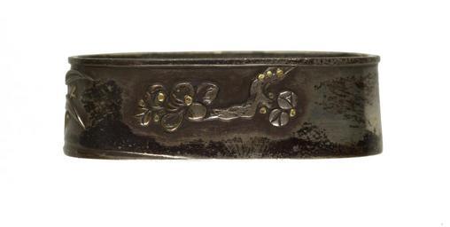 | Keywords: Japanese - Fuchi with Bamboo and Plums - Walters 5112433A - Back.jpg The fuchi is decorated with bamboo on the front and plum blossoms on the reverse It may have originally been paired with a kashira depicting pine trees because those three plants are known as the three friends of winter This is part of a mounted set early-mid 19th century Edo shibuichi gold cm 3 9 2 1 1 2 accession number 51 1243 3A 79624 Henry Walters Baltimore date and mode of acquistion unknown Walters Art Museum Henry Walters Acquired by Henry Walters Mark Assembly mark in ink inside fuchi i jyô tsu ki place of origin Japan Walters Art Museum license Fuchi in the Walters Art Museum White background Media contributed by the Walters Art Museum needs category review |
