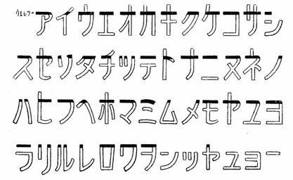 | Keywords: Japanese katakana typeface having upper line.png Japanese katakana typeface having the upper line to form the unity of characters consisting a word This image was scanned at 300 dpi 単語をなす文字のまとまりをつくるために ウエレツ をもっているカタカナの書体 このイメージは300 dpiでスキャンされた Kanamozikai Kana Character Foundation p 70 1935 カナモジカイ と 国語 協会 文字 文化 展覧会 出品物 解説 カナモジカイ 第70ページ 1935年 1935 カナモジカイ と 国語 協会 <div lang en xml lang en > Reason and typeface for horizontal writing with katakana At the beginning of the kana character movement in the Meiji period vertical writing with hiragana was used However it needs to be read character by character and even a person used to it could not read it as fast as writing with kanji Hence the movement did not spread at last Research was made later and as its result it was shown that left-to-right horizontal katakana writing with improved typefaces can be read as fast as writing of western languages in which characters are combined to form a unit Consequently it can be safely said that today's kana character movement is equal to the horizontal katakana movement Characters of conventional katakana typefaces differ character by character in angles of their strokes and do not create unity Nevertheless so drastic modification of typeface is undesirable that anyone cannot read without learning The Kanamojikai is trying to arrange the typeface within the scope of everyone's immediate recognition of the characters and it has already manufactured movable types having several different typefaces Characters having a unity require not only modification of each character but also introduction of connecting element commonly included in every character In Latin alphabet the baseline under k h m etc behaves as the element; in katakana the black elements shown in the figure below do the same Lines sticking out of the top of characters ウ U カ KA etc work for making each word have a unique distinctive form With this typeface people can read words just in the same way as a person used to English writing reads the three characters of boy at a glance </div> PD-Japan This image is in the public domain under Article 53 1 of the Copyright Act of Japan because it was authored under the names of corporate bodies and published more than 50 years ago Kanamozikai CJK typeface samples Gojūon katakana |