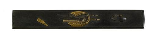 | Keywords: Japanese - Kozuka with Japanese Household Objects - Walters 51782.jpg The tools shown on this kozuka could be found in a traditional Japanese household On the left are sissors used for cutting paper In the center is a stack of folded Japanese paper Below the paper are metal tongs used for moving hot pieces of coal At the right are two clam shells date gold shakudo copper cm 9 6 accession number 51 782 12373 Henry Walters Baltimore date and mode of acquisition unknown Walters Art Museum Henry Walters Acquired by Henry Walters none place of origin Japan Walters Art Museum license Kozuka in the Walters Art Museum Media contributed by the Walters Art Museum needs category review |