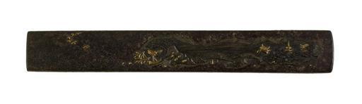 | Keywords: Japanese - Kozuka with a Mountain Landscape - Walters 51654.jpg This kozuka depicts a landscape near water Two bodies of land on in the middle and one on the right are connected by a bridge At the right the top of a pagoda and other temple buildings can be seen above the tree tops On the left side of the bridge are huts There are boats in the water to the left of the huts In the background mists shroud distant mountains At the left of the kozuka six geese are depicted in flight date iron gold cm 9 9 accession number 51 654 6415 Henry Walters Baltimore date and mode of acquisition unknown Walters Art Museum Henry Walters Acquired by Henry Walters none place of origin Japan Walters Art Museum license Tosogu Japanese sword fittings in the Walters Art Museum Media contributed by the Walters Art Museum needs category review |
