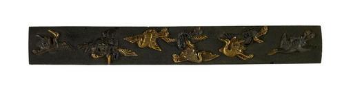 | Keywords: Japanese - Kozuka with Nine Flying Cranes - Walters 51762.jpg The front of the kozuka is decorated with nine copper alloy silver and gold cranes in flight The background is in a fish egg pattern nanako-ji Cranes are a symbol of longevity and an auspicious motif This is only the decorative front plate date shakudo gold copper cm 9 5 accession number 51 762 14963 Henry Walters Baltimore date and mode of acquisition unknown Walters Art Museum Henry Walters Acquired by Henry Walters none place of origin Japan Walters Art Museum license Kozuka in the Walters Art Museum Media contributed by the Walters Art Museum needs category review |