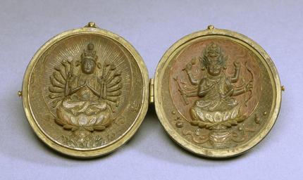 | Keywords: Japanese - Locket with Two Buddhist Deities - Walters 61278 - Open.jpg This locket features two Buddhist deities with different functions On the left is the 1 000-armed Kannon Avalokiteshvara symbolizing compassion for all living creatures On the right is a King of Desire named Aizen Myoo with a ferocious facial expression The lion head over his forehead stands for his capacity to transform lust into pure love This locket made to be carried by a Buddhist priest is likely to have survived because it was part of a sacred deposit inside a large wooden image in a temple century 13 Kamakura wood sandalwood lacquer and gilt bronze cm 5 8 accession number 61 278 21897 Wakai Kanesaburo Centennial Exhibition Philadelphia 1876 William T / Henry Walters Collection Baltimore Walters Art Museum Henry Walters Acquired by William T or Henry Walters Centennial Exhibition Philadelphia Memorial Hall Philadelphia Philadelphia 1876 place of origin Japan Walters Art Museum license Art of Japan in the Walters Art Museum Media contributed by the Walters Art Museum needs category review Aizen Myō-ō |