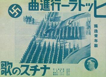| Keywords: Japanese record Nazi parade song cover 1934.jpg en Album cover of a w Japanese w record published by w Nitto Records ja タイヘイレコード containing a w Nazi w parade song w Hakushū Kitahara w 北原白秋 wrote the lyrics for a welcome song for the 1938 Hitlerjugend delegation image at forum axishistory com/viewtopic php t 101635 Published by Sunday Mainichi Shimbun newspaper January 28 1934 1934-01-28 PD-Japan-oldphoto Metadata from image Nazi symbol 1934 in Japan Music in 1934 Hitlerjugend Relations of Germany and Japan Japanese album covers |