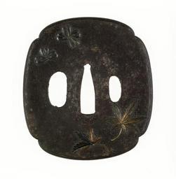 | Keywords: Japanese (signature illegible) - Tsuba with Maple Leaves and Cherry Blossoms - Walters 51142.jpg This tsuba is decorated with the most popular motifs for spring and autumn Cherry blossoms at the upper right are a sign of spring The flowers are made of silver Maple leaves which are associated with autumn are in the lower left One leaf is made of gold The other is decorated with copper and a copper alloy with gold Both cherry blossoms and maple leaves inspire picnics and other activities center on enjoying their beauty century 19 Edo-Meiji iron copper silver cm 7 3 6 6 0 44 accession number 51 142 4397 Henry Walters Baltimore date and mode of acquisition unknown Walters Art Museum Henry Walters Acquired by Henry Walters Signature illegible place of origin Japan Walters Art Museum license Tsuba in the Walters Art Museum White background Media contributed by the Walters Art Museum needs category review |