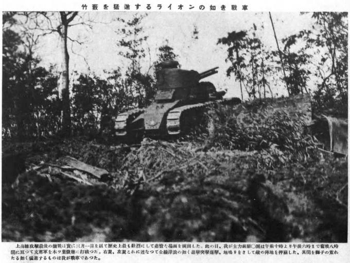 | Keywords: Japanese tank advancing like a lion through a bamboo grove.jpg en Japanese tank advancing like a lion through a bamboo grove ja 竹藪を猛 するライオンの如き戰車 Date of publication March 1932 忠 之日 社編輯部編 日支事變寫 帖 昭和七年三 忠 之日 社 March 1932 unknown photographer PD-Japan-oldphoto Uploaded with UploadWizard Renault NC series Battle of Shanghai 1932 - Japanese forces | ||||