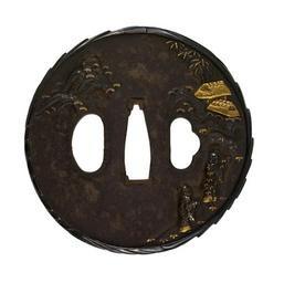 | Keywords: Japanese - Tsuba with Chinese Gentlemen and Mountain Huts - Walters 51245.jpg On the right side of this mountain two men climb towards to mountain huts at the upper right They are dressed in Chinese style clothing but the roofs of the hut are depicted as Japanese farm houses A mountain peak is shown at the upper left On the reverse a man carries a gourd on a bamboo pole This tsuba may represent a specific story or be a generalized reference to the theme of scholars visiting each other The band around the edge of the tsuba is carved in a stylized wood grain pattern date iron gold detail copper silver cm 7 2 accession number 51 245 6952 Henry Walters Baltimore date and mode of acquisition unknown Walters Art Museum Henry Walters Acquired by Henry Walters none place of origin Japan Walters Art Museum license Tsuba in the Walters Art Museum Media contributed by the Walters Art Museum needs category review |