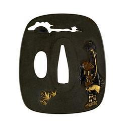 | Keywords: Japanese - Tsuba with a Cormorant Fisherman - Walters 51378.jpg The man at the right holds a large ladle upon which a cormorant bird is perched He holds a lease for the bird in his right hand Cormorants were traditionally used to catch fish in rivers in some parts of Japan A ring was tied around the bird's neck to prevent it from swallowing the fish it caught The moon in clouds at the upper left of the tsuba indicates that this is night time when cormorants were used for fishing On the reverse is a boat at a river bank date shibuichi gold copper cm 6 7 accession number 51 378 12777 Henry Walters Baltimore date and mode of acquisition unknown Walters Art Museum Henry Walters Acquired by Henry Walters none place of origin Japan Walters Art Museum license Tsuba in the Walters Art Museum Media contributed by the Walters Art Museum needs category review |