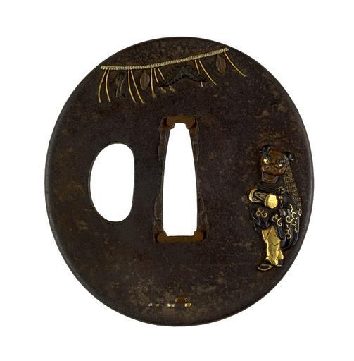 Keywords: Japanese - Tsuba with a New Year's Lion Dancer - Walters 51365.jpg The motifs of this tsuba illustrate traditional New Year's customs On the right is a man dressed as a lion who performs a celebratory dance At the upper left is a decorative rope shimenawa including pine boughs which are hung on homes during the New Year's season At the lower edge on the reverse is a small table with traditional offerings date iron gold copper cm 6 5 accession number 51 365 12126 Henry Walters Baltimore date and mode of acquisition unknown Walters Art Museum Henry Walters Acquired by Henry Walters none place of origin Japan Walters Art Museum license Tsuba in the Walters Art Museum Reliefs of dancers on Japanese sword fittings Media contributed by the Walters Art Museum needs category review |