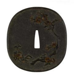 | Keywords: Japanese - Tsuba with Plum Blossoms - Walters 51358.jpg Plum blossoms which are associated with early spring decorate the front of this tsuba Plum is the first flower to bloom as winter ends Another flower is shown on the reverse century 18 19 iron silver copper cm 8 5 accession number 51 358 39471 Henry Walters Baltimore date and mode of acquisition unknown Walters Art Museum Henry Walters Acquired by Henry Walters none place of origin Japan Walters Art Museum license Tsuba in the Walters Art Museum Media contributed by the Walters Art Museum needs category review |