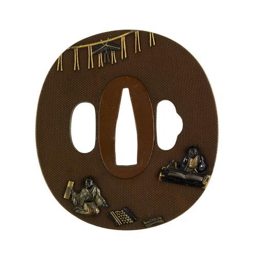 | Keywords: Japanese - Tsuba with Poetry Composition at New Year's - Walters 51230.jpg At the lower right of this tsuba a seated man dips his brush in ink A sheet of paper is spread on the tray or small table in front of him Another man sits at the lower left At the upper left and on the reverse are New Year's decorations incorporating pine boughs Pines are a symbol of longevity and feature prominently in New Year's decorations date copper gold silver shakudo cm 7 4 6 76 0 49 accession number 51 230 31466 Henry Walters Baltimore date and mode of acquisition unknown Walters Art Museum Henry Walters Acquired by Henry Walters none place of origin Japan Walters Art Museum license Tsuba in the Walters Art Museum Media contributed by the Walters Art Museum needs category review |