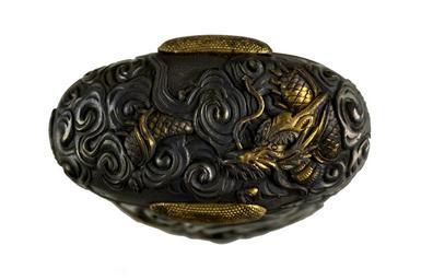 | Keywords: Japanese - Tsuka with Dragons in Clouds - Walters 5112193B - Detail A.jpg Three gold dragons emerge from clouds on the tsuka One is on the kashira and one is on either side of the handle Other than the kashira the tsuka is worked in a single piece of metal without menuki or wrapping This is part of a mounted set century 18 Edo wood iron silver sentoku gold cm 14 5 accession number 51 1219 3B 79606 Henry Walters Baltimore date and mode of acquistion unknown Walters Art Museum Henry Walters Acquired by Henry Walters none place of origin Japan Walters Art Museum license Tsuka in the Walters Art Museum Media contributed by the Walters Art Museum needs category review |