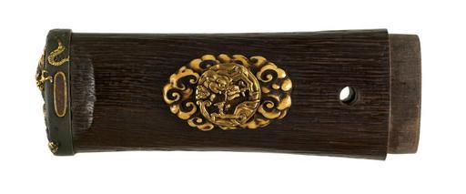 | Keywords: Japanese - Tsuka with Emperor, Dragon and Tiger - Walters 5112323B.jpg The seated figure in a cart on the kashira might be the Chinese general Gentoku Ch Liu Bei Liu Pei He was an important figure in the 2nd century and his story is part of the legend The Romance of the Three Kingdoms Gentoku eventually became emperor of Shu Shu A dragon appears over his cart to protect him The menuki are in the shape of a dragon and a tiger These two animals are commonly paired as a symbol of a ruler and his advisers This is part of a mounted set century 19 Edo-Meij wood ivory gold sentoku copper cm 10 5 accession number 51 1232 3B 79635 Henry Walters Baltimore date and mode of acquistion unknown Walters Art Museum Henry Walters Acquired by Henry Walters none place of origin Japan Walters Art Museum license Tsuka in the Walters Art Museum Media contributed by the Walters Art Museum needs category review |
