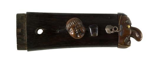| Keywords: Japanese - Tsuka with Masks - Walters 5111873B.jpg Three masks probably for use in comic plays kyôgen are shown on this tsuka The kashira is a long-nosed tengu demon mask The menuki are masks for sake-loving shôjô Behind each mask is a sake ladle This is part of a mounted set century 19 Edo-Meiji black lacquer stained wood copper alloy silver gold cm 11 9 accession number 51 1187 3B 79341 William T / Henry Walters Collection Baltimore date and mode of acquisition unknown Walters Art Museum Henry Walters Acquired by William T or Henry Walters none place of origin Japan Walters Art Museum license Tsuka in the Walters Art Museum Media contributed by the Walters Art Museum needs category review Tengu |