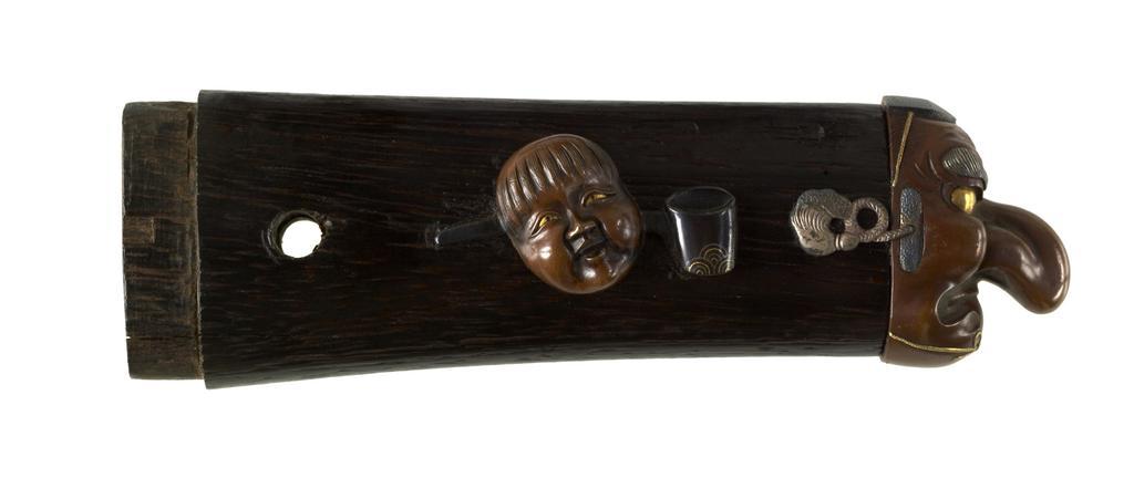 Keywords: Japanese - Tsuka with Masks - Walters 5111873B.jpg Three masks probably for use in comic plays kyôgen are shown on this tsuka The kashira is a long-nosed tengu demon mask The menuki are masks for sake-loving shôjô Behind each mask is a sake ladle This is part of a mounted set century 19 Edo-Meiji black lacquer stained wood copper alloy silver gold cm 11 9 accession number 51 1187 3B 79341 William T / Henry Walters Collection Baltimore date and mode of acquisition unknown Walters Art Museum Henry Walters Acquired by William T or Henry Walters none place of origin Japan Walters Art Museum license Tsuka in the Walters Art Museum Media contributed by the Walters Art Museum needs category review Tengu