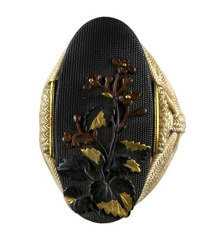 | Keywords: Japanese - Tsuka with Rooster, Chicken, and Hollyhock - Walters 5112593B - Detail A.jpg The tsuka is wrapped with a white silk cord that holds in place the two menuki One menuki is in the shape of a rooster and the other is in the shape of a chicken The hollyhock kashira matches the fuchi mounted on the same sword This is part of a mounted set century 19 Edo black lacquer with green netting silver gold shakudo shibuichi sentoku cm 21 4 accession number 51 1259 3B 79199 Henry Walters Baltimore date and mode of acquisition unknown Walters Art Museum Henry Walters Acquired by Henry Walters none place of origin Kyoto Japan Walters Art Museum license Tsuka in the Walters Art Museum Media contributed by the Walters Art Museum needs category review Gotô Ichijô |