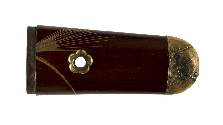 | Keywords: Japanese - Tsuka with Wheat Stalks and Plum Blossoms - Walters 5111662B.jpg The body of the tsuka like the accompanying saya is decorated with stalks of wheat in gold inlay The kashira depicts branches of plum blossoms Plums are the first tree to flower at the end of winter This is part of a mounted set century 18 19 Edo wood gold lacquer red stain sentoku gold cm 7 accession number 51 1166 2B 79340 Henry Walters Baltimore date and mode of acquistion unknown Walters Art Museum Henry Walters Acquired by Henry Walters none place of origin Japan Walters Art Museum license Tsuka Media contributed by the Walters Art Museum needs category review Katô Jûkashichi |