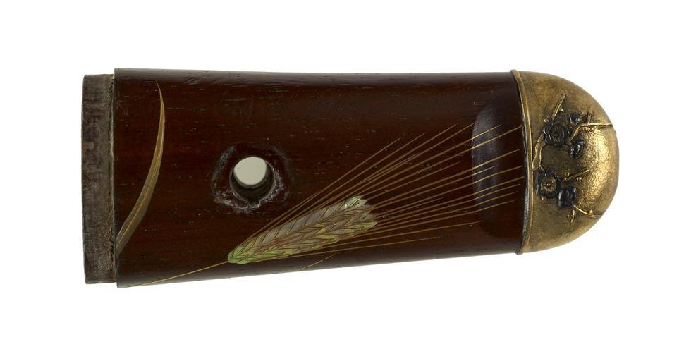 | Keywords: Japanese - Tsuka with Wheat Stalks and Plum Blossoms - Walters 5111662B - Back.jpg The body of the tsuka like the accompanying saya is decorated with stalks of wheat in gold inlay The kashira depicts branches of plum blossoms Plums are the first tree to flower at the end of winter This is part of a mounted set century 18 19 Edo wood gold lacquer red stain sentoku gold cm 7 accession number 51 1166 2B 79340 Henry Walters Baltimore date and mode of acquistion unknown Walters Art Museum Henry Walters Acquired by Henry Walters none place of origin Japan Walters Art Museum license Tsuka Media contributed by the Walters Art Museum needs category review Katô Jûkashichi |