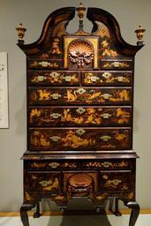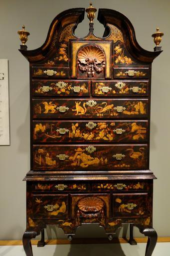 | Keywords: Japanned high chest, signed in chalk 'Pim', case by John Pimm, Boston, Massachusetts, 1740-1750, soft maple, black walnut, white pine, mahogany, paint, gesso, original brass, view 2 - Winterthur Museum - DSC01401.JPG en Exhibit in the Winterthur Museum New Castle County Delaware USA Photography was permitted in the museum without restriction This work is in the public domain because the artist died more than 70 years ago 2013-05-08 10 54 19 own Daderot cc-zero Furniture in Winterthur Museum Uploaded with UploadWizard American Queen Anne style furniture High chests of drawers |
