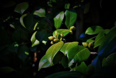 Keywords: japonica buds tree japonica flower buds green leaves shiny