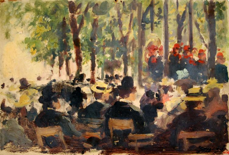 | Keywords: Jardin du Luxembourg - Gaspar Miró i Lleó - 8836.JPG Artwork Creator Gaspar Miró i Lleó Jardin du Luxembourg La escena té lloc en un exterior jardí o parc En primer terme es veu un grup de senyores i senyors vestits elegantment sentats en cadires Al fons envoltats d'arbres es troba un grup de persones vestides d'uniforme soldats banda de música que semblen estar oferint algun tipus d'espectacle between Oil on canvas cm Institution Biblioteca Museu Víctor Balaguer object history exhibition history credit line accession number 8836 place of creation París Biblioteca Museu Víctor Balaguer-cooperation PD-Art PD-old-100-1923 Uploaded with UploadWizard Paintings in the Biblioteca Museu Víctor Balaguer Art of Catalonia Historical images of the Jardin du Luxembourg Gaspar Miró i Lleó |