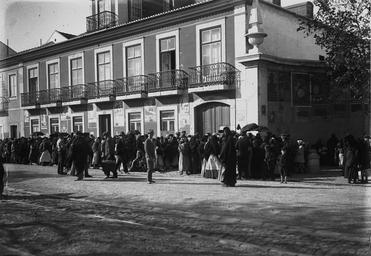 | Keywords: JBN001438 - Na Junqueira, as pessoas aguardam a abertura do armazém regulador de preços.jpg TÃtulo Na Junqueira as pessoas aguardam a abertura do armazém regulador de preços a cargo da Assistência 5 de Dezembro Dimensão 9 x 12 cm Suporte Negativo de gelatina e prata em vidro Notas Inscrição no original 7605 Artigo na Ilustração Portuguesa 1918 28 de Outubro Assunto Obra de Assistência 5 de Dezembro / Multidão / Junqueira rua Alcântara Lisboa Portugal Código de referência PT/AMLSB/JBN/001438 Institution Arquivo Municipal de Lisboa http //arquivomunicipal cm-lisboa pt/sala/online/ui/searchbasic aspx search _OB 2b_QT MFN__Q 197716_EQ T_D T___ type PCD mode 0 page 0 res 0 Colecção Benoliel Arquivo Municipal de Lisboa 1918 Creator Joshua Benoliel PD-old-auto-1923 1932 Rua da Junqueira Photos of Lisbon uploaded by Darwinius 1918 in Lisbon 1918 photographs Assistência 5 de Dezembro Social service buildings in Portugal Bread lines in Lisbon Tram tracks in Lisbon Ilustração Portuguesa Ž Images from the Arquivo Municipal de Lisboa Photographs by Joshua Benoliel Iron railing balconies in Lisbon Finials in Portugal Guard stones in Portugal Chafariz da Junqueira Buildings in Lisbon |