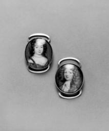 | Keywords: Jean Petitot le Jeune - Portraits of Louis Bourbon and Marie-Adelaide of Savoy, Duke and Duchess of Burgundy - Walters 3894, 3895.jpg Louis Bourbon 1682-1712 was the grandson of King Louis XIV He became heir to his grandfather's throne after his own father died in 1711 Louis Bourbon died in 1712 probably from the plague a few days after his wife Marie-Adelaide of Savoy 1685-1712 Their son born in 1710 became King Louis XV upon the death of Louis XIV in 1714 The couple married in 1697 and their apparent ages in the portraits suggest a date not long thereafter Wearing these portraits which are mounted for inclusion in a bracelet would be a sign of political allegiance The artist is an unidentified follower of Jean Petitot ca 1697 1700 painted enamel on gold cm 2 6 accession number 38 94 38 95 79107 George Robinson Harding London date and mode of acquisition unknown Henry Walters city Baltimore Walters Art Museum Henry Walters Acquired by Henry Walters 1911 place of origin France Walters Art Museum license Baroque art in the Walters Art Museum Jewellery in the Walters Art Museum Jean Petitot le Jeune Painted enamel art in the Walters Art Museum |