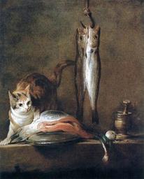 | Keywords: Jean Siméon Chardin - Still-Life with Cat and Fish - WGA04739.jpg Artwork Creator Jean Siméon Chardin 1728 Oil on canvas size cm 79 63 Institution Museo Thyssen-Bornemisza object history credit line accession number WGA link 4739 http //www wga hu/art/c/chardin/1/01still1 jpg http //www wga hu/html/c/chardin/1/01still1 html PD-old-100 painting still-life French 1701-1750 WGA form painting WGA type still-life WGA School French WGA time period 1701-1750 Still life paintings by Jean Siméon Chardin 18th-century paintings in the Thyssen-Bornemisza Museum French paintings in the Thyssen-Bornemisza Museum 1720s oil on canvas paintings in Spain 1720s still life paintings 1728 oil on canvas paintings 1728 paintings from France 18th-century paintings of cats 18th-century still life paintings in Spain Fishing in art Fishing hooks Paintings of fish Still life paintings of cats |