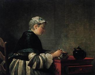 | Keywords: Jean Siméon Chardin - Woman Taking Tea - WGA04749.jpg Artwork Creator Jean Siméon Chardin 1735 Oil on canvas size cm 81 99 Institution The Hunterian Art Gallery Glasgow http //www huntsearch gla ac uk/cgi-bin/foxweb/huntsearch/DetailedResults fwx collection art reqMethod Search Searchterm 43512 Hunterian Museum and Art Gallery Glasgow object history credit line bequeathed by Dr William Hunter 1783 J B Chardin 1735 ~ lower right signature and date accession number GLAHA 43512 WGA link 4749 http //www wga hu/art/c/chardin/1/071woman jpg http //www wga hu/html/c/chardin/1/071woman html PD-old-100 painting genre French 1701-1750 Genre paintings by Jean-Baptiste Siméon Chardin Paintings in the Hunterian Museum and Art Gallery Chardin 3 1735 paintings WGA form painting WGA type genre WGA School French WGA time period 1701-1750 1730s paintings from France |