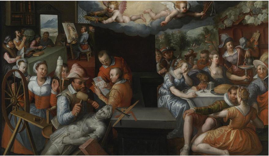 | View Original: | Jeremias van Winghe (Attr.) - The glorification of art and diligence and the punishment of gluttony and earthly pleasure.jpg (1667x971) | |||