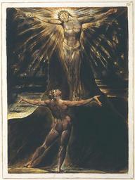 | Keywords: Jerusalem The Emanation of The Giant Albion, copy E, object 76 (Bentley 76, Erdman 76, Keynes 76).jpg en Jerusalem The Emanation of The Giant Albion copy E object 76 Bentley 76 Erdman 76 Keynes 76 Facing away from the viewer with his legs spread and arms raised horizontally a nude male with short curly hair stands on a strip of grass at the foot of a large tree looking almost straight up at the body of a long-haired bearded male with loincloth very bright halo and crown of thorns crucified on its branches The arm positions of the two figures are similar Nails or spikes are visible in the hands and feet of the crucified figure whose eyes are closed and whose head rests on his right shoulder suggesting that he may be dead The two figures are identified on other impressions of this plate as Albion below and Jesus above but the names are variously obscured in different copies and invisible here The tree judging from its leaves and trunk appears to be an oak and its fruit is thus presumably acorns but lit and colored in a way that makes them seem golden and ”especially on the right ”so as to make them look more like apples perhaps recollecting the fateful tree in Eden The scene is dark as if at night; streaks of light in the sky and a lighted area above the horizon on the left suggest that the time is sunrise or sunset 2003-02-15 14 16 41 Institution William Blake Archive http //www blakearchive org/exist/blake/archive/object xq objectid jerusalem e illbk 76 java no Creator William Blake PD-old-100 Uploaded with UploadWizard Jerusalem The Emanation of the Giant Albion - copy E 076 Loincloths in art |