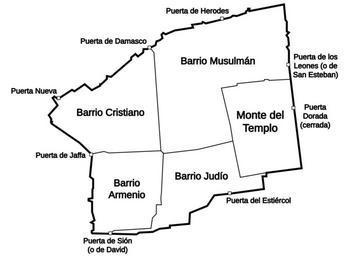 | Keywords: Jerusalem oldcity es.svg A diagram of the quarters of the old city of Jerusalem - titles in spanish Plano de los barrios y puertas de la Ciudad Vieja de Jerusalén translated from here based on en image OldCityMap png 2007-09-19 Benherz translated to Spanish by Kordas Benherz Maps of the Old City of Jerusalem |