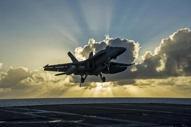 Keywords: jet aircraft landing arrested aircraft carrier crepuscular rays sky light clouds ship usa navy military fighter plane airplane f-18 hornet