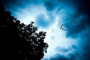 Keywords: jet planes contrails sky clouds night evening trees silhouette dark blue