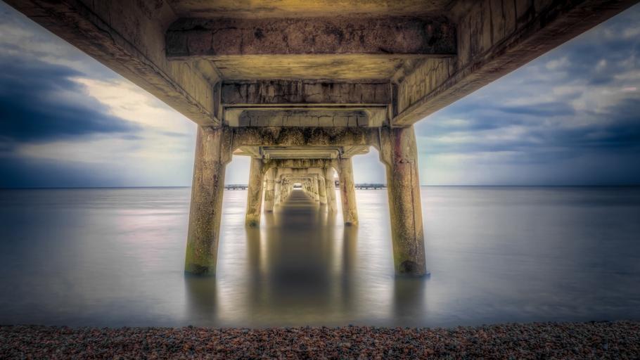 Keywords: jetty pier underneath wooden structure piles poles building coast shore beach ocean sea water pebbles vacation holidays scenic