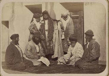 Keywords: Jewish Wedding Rituals. Two Men Representing the Families of the Bride and Groom Finalizing the Wedding Agreement WDL10711.png Artwork ru Кун Александ Людвигович 1840 1888 гг fr Kun Aleksandr L 1840-1888 en Kun Aleksandr L 1840-1888 zh 亚历山大·L· ,1840-1888 年 pt Kun Aleksandr L 1840-1888 ar كُن، ألكسندر ل ، 1840-1888 es Kun Aleksandr L 1840-1888 ru Ев ейские свадебные об яды Двое мужчин п едставляющих семьи жениха и невесты заключают свадебный догово fr Rituels de mariage juifs Deux hommes représentant les familles des fiancés finalisant le contrat de mariage en Jewish Wedding Rituals Two Men Representing the Families of the Bride and Groom Finalizing the Wedding Agreement zh 犹太人的婚礼仪式 两位男 代表新娘和新郎的家人签订婚约 pt Rituais de casamento dos judeus Dois homens que representam as famílias do noivo e da noiva finalizando o contrato de casamento ar طقوس الزفاف اليهودي وكيلا أسرتي العروس والعريس يُجريان عقد الزواج ru Эта фотог афия входит в этног афическую часть <em> Ту кестанского альбома </em><em></em> всесто оннего исследования Цент альной Азии п едп инятого после того как в 1860-х годах в егионе установилось господство Российской импе ии Альбом созданный по аспо яжению гене ала Константина Пет овича фон Кауфмана 1818 1882 годы пе вого гене ал-губе нато а оссийского Ту кестана состоит из четы ех частей в шести томах «Часть а хеологическая» два тома «Часть этног афическая» два тома «Часть п омысловая» один том и «Часть исто ическая» один том Основным составителем альбома был оссийский востоковед Александ Людвигович Кун аботавший совместно с иколаем Венедиктовичем Богаевским В альбоме п едставлено около 1200 фотог афий а также а хитекту ные планы аква ельные исунки и ка ты «Часть этног афическая» включает в себя 491отдельную фотог афию на 163 листах а фотог афиях изоб ажены п едставители азличных на одов егиона листы 1 33 повседневная жизнь и итуалы листы 34 91 а также виды де евень и го одов уличные то говцы и комме ческая деятельность листы 92 163 <br>Этног афические фотог афии; Г упповые по т еты; Ев еи; авы и обычаи; Фотог афические исследования; По т етные фотог афии; Свадьбы fr Cette photographie est extraite de la partie ethnographique de l'<em>Album du Turkestan</em> étude visuelle complète de l'Asie centrale entreprise après que l'Empire russe prit le contrôle de la région dans les années 1860 Commandé par le général Konstantin Petrovich von Kaufman 1818 1882 premier gouverneur général du Turkestan russe l'album est composé de six volumes en quatre parties la partie archéologique deux volumes la partie ethnologique deux volumes la partie sur les métiers un volume et la partie historique un volume L'album fut essentiellement compilé par l'orientaliste russe Aleksandr L Kun assisté de Nikolai V Bogaevskii Il comporte près de 1200 photographies et inclut également des plans architecturaux des dessins à l'aquarelle et des cartes La partie ethnographique compte 491 photographies sur 163 planches montrant des individus des différentes peuplades de la région planches 1 à 33 des scènes de la vie quotidienne et des rites planches 34 à 91 ainsi que des vues de villages et de villes de vendeurs ambulants et d'activités commerciales planches 92 à 163 <br>Photographies ethnographiques; Portraits de groupe; Juifs; Mœurs et coutumes; Inventaires photographiques; Portraits photographiques; Noces en This photograph is from the ethnographical part of <em>Turkestan Album</em><em> </em>a comprehensive visual survey of Central Asia undertaken after imperial Russia assumed control of the region in the 1860s Commissioned by General Konstantin Petrovich von Kaufman 1818 82 the first governor-general of Russian Turkestan the album is in four parts spanning six volumes Archaeological Part two volumes ; Ethnographic Part two volumes ; Trades Part one volume ; and Historical Part one volume The principal compiler was Russian Orientalist Aleksandr L Kun who was assisted by Nikolai V Bogaevskii The album contains some 1 200 photographs along with architectural plans watercolor drawings and maps The Ethnographic Part includes 491 individual photographs on 163 plates The photographs show individuals representing the different peoples of the region Plates 1 33 ; daily life and rituals Plates 34 91 ; and views of villages and cities street vendors and commercial activities Plates 92 163 <br>Ethnographic photographs; Group portraits; Jews; Manners and customs; Photographic surveys; Portrait photographs; Weddings zh 这张照片出自<em> 其斯 相册 </em>的民族部分,该相册是俄罗斯 国 19 世纪 60 年代取得中亚控制 后, 手制 的 部针对该 区的综合 图像调查记录 相册由俄罗斯驻 其斯 (俄罗斯 国中亚属 的名称)首任 康斯 丁·彼得罗维奇·凡· 夫曼(Konstantin Petrovich von Kaufman,1818 82