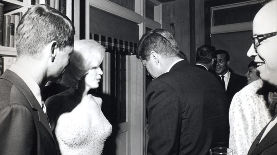 | Keywords: JFK and Marilyn Monroe 1962.jpg U S President John F Kennedy with his back to the camera U S Attorney General Robert Kennedy far left and actress Marilyn Monroe on the occasion of President Kennedy's 45th birthday celebrations at Madison Square Garden in New York City Arthur M Schlesinger Jr is at the far right Facing the camera in the rear appears singer Harry Belafonte http //www cnn com/2010/SHOWBIZ/06/01/marilyn monroe birthday photo/index html; first version uploaded was from http //www pbs org/wgbh/roadshow/fts/orlando_200702A13_09 html 1962-05-19 Cecil W Stoughton official White House photographer PD-USGov 1962 in New York City John F Kennedy in 1962 Black and white photographs of people Marilyn Monroe Photographs by Cecil W Stoughton Robert F Kennedy Arthur M Schlesinger Jr Harry Belafonte ImageNote 1 72 35 94 122 465 315 2 Robert Kennedy ImageNoteEnd 1 ImageNote 2 236 45 128 102 465 315 2 John F Kennedy ImageNoteEnd 2 ImageNote 3 405 5 59 193 465 315 2 Arthur M Schlesinger Jr ImageNoteEnd 3 ImageNote 4 165 65 56 108 465 315 2 Marilyn Monroe ImageNoteEnd 4 ImageNote 5 368 79 29 45 465 315 2 Harry Belefonte ImageNoteEnd 5 ImageNote 6 31 11 133 216 640 360 2 Robert F Kennedy ImageNoteEnd 6 ImageNote 7 173 98 83 126 640 360 2 Marilyn Monroe ImageNoteEnd 7 ImageNote 8 309 68 130 144 640 360 2 John F Kennedy ImageNoteEnd 8 ImageNote 9 485 113 58 70 640 360 2 Harry Belafonte ImageNoteEnd 9 ImageNote 10 564 2 75 231 640 360 2 Arthur M Schlesinger Jr ImageNoteEnd 10 |