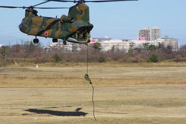 Keywords: JGSDF 1st Airborne Brigade - Fast rope 20090111(Narashino).JPG ja 習志野演習場 2009年1 11日 第 空挺団降下訓練始めにて撮影 CH-47よりの降下 CH-47J Narashino Japan 習志野演習場 2009-01-11 Los688 own Kawasaki CH-47 Camp Narashino Fast roping 1st Airborne Brigade Japan